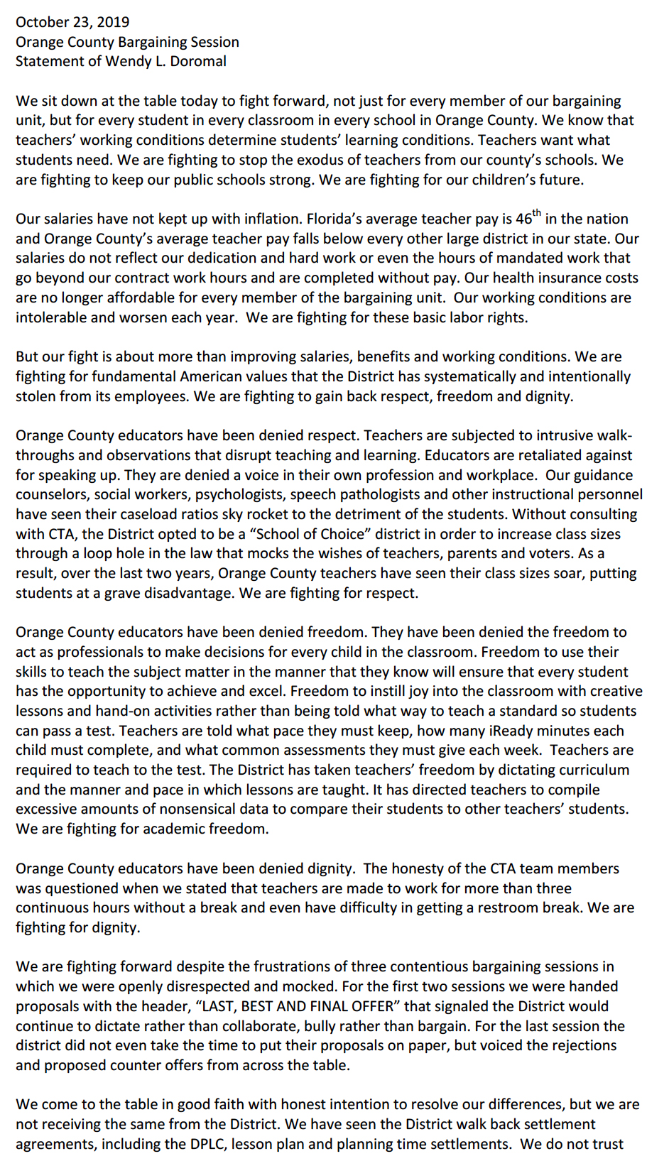 Opening Statement by President Wendy Doromal Bargaining Session, October 30, 2019:
